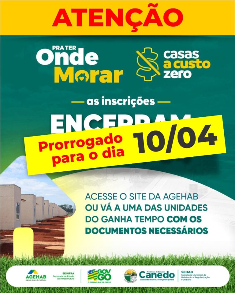 As inscrições das “99 casas à custo zero” da AGEHAB foram prorrogadas até dia 10 de Abril. A Prefeitura de Senador Canedo,