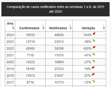 A Secretaria de Saúde de Goiás divulgou que 83 municípios estão em situação de emergência por dengue. Segundo a pasta, seis mortes já foram confirmadas em Goiás em 2024. Sendo três em Uruaçu, uma em Águas Lindas de Goiás, uma em Iporá e uma em Cristalina.