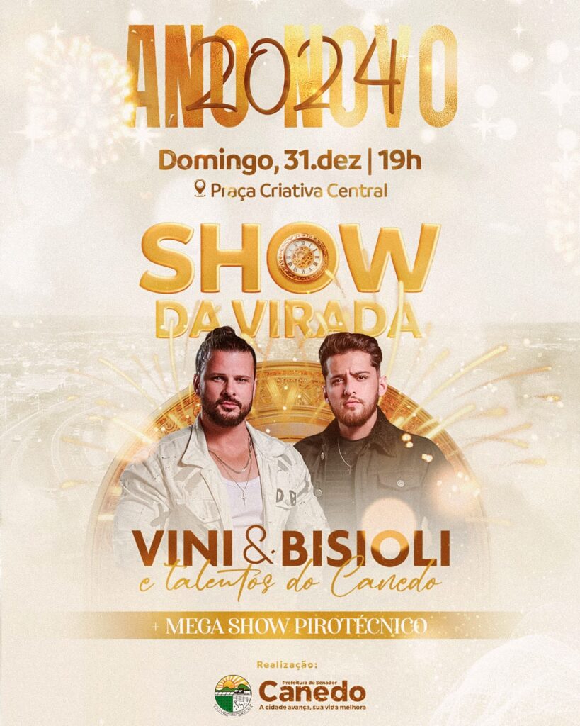 2024 vai chegar com muita música em Senador Canedo. No próximo domingo, dia 31, a Praça Criativa Central vai receber o Show da Virada, promovido pela Prefeitura Municipal, em parceria com a Rádio Positiva FM. A grande atração da noite será a dupla Vini e Bisioli, que vem se destacando com várias músicas sendo curtidas nas plataformas especializada e nas. redes sociais. Antes da dupla, artistas locais sobem ao placo. A dupla comanda a contagem regressiva com um grande show pirotécnico.